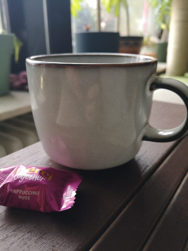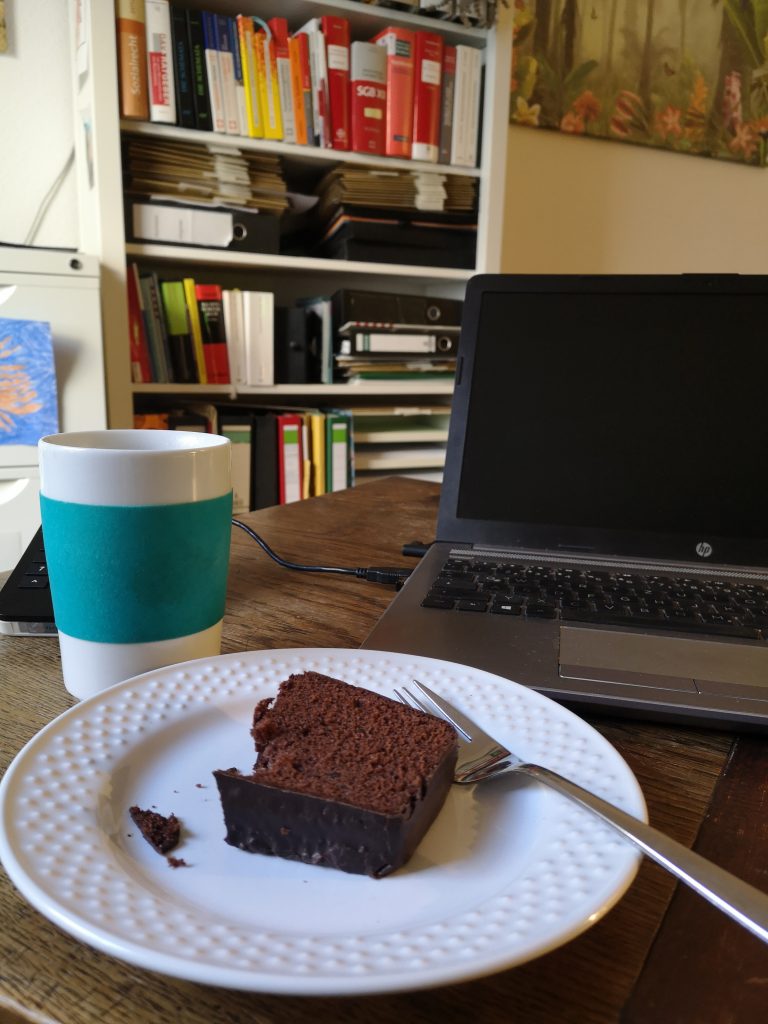 Ungesundes Frühstück im Büro. Wenn das die Kinder wüssten. Ab und zu muss ich diesen Kuchen kaufen. Er erinnert mich an meine Uroma.