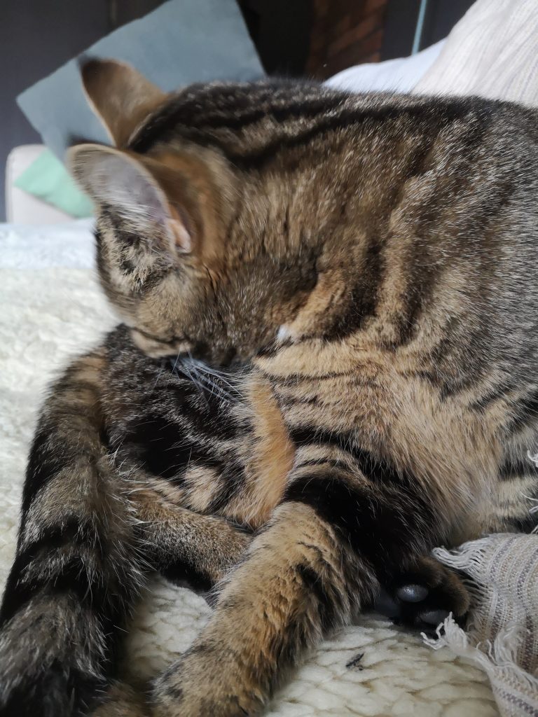 Lulu merkt jedenfalls nichts von der Aufregung, die beim Lesen entsteht. Ausgiebige Fellpflege.